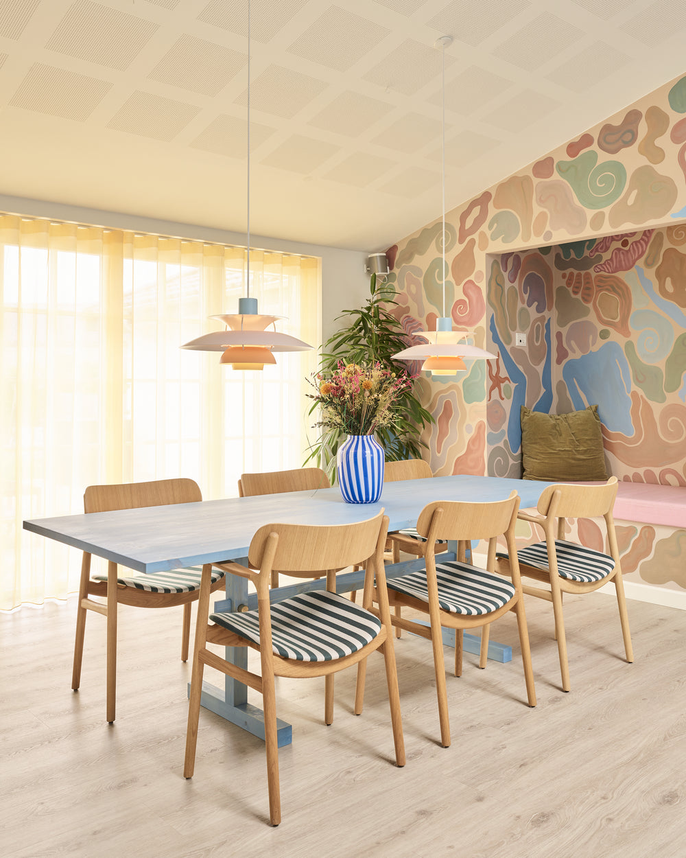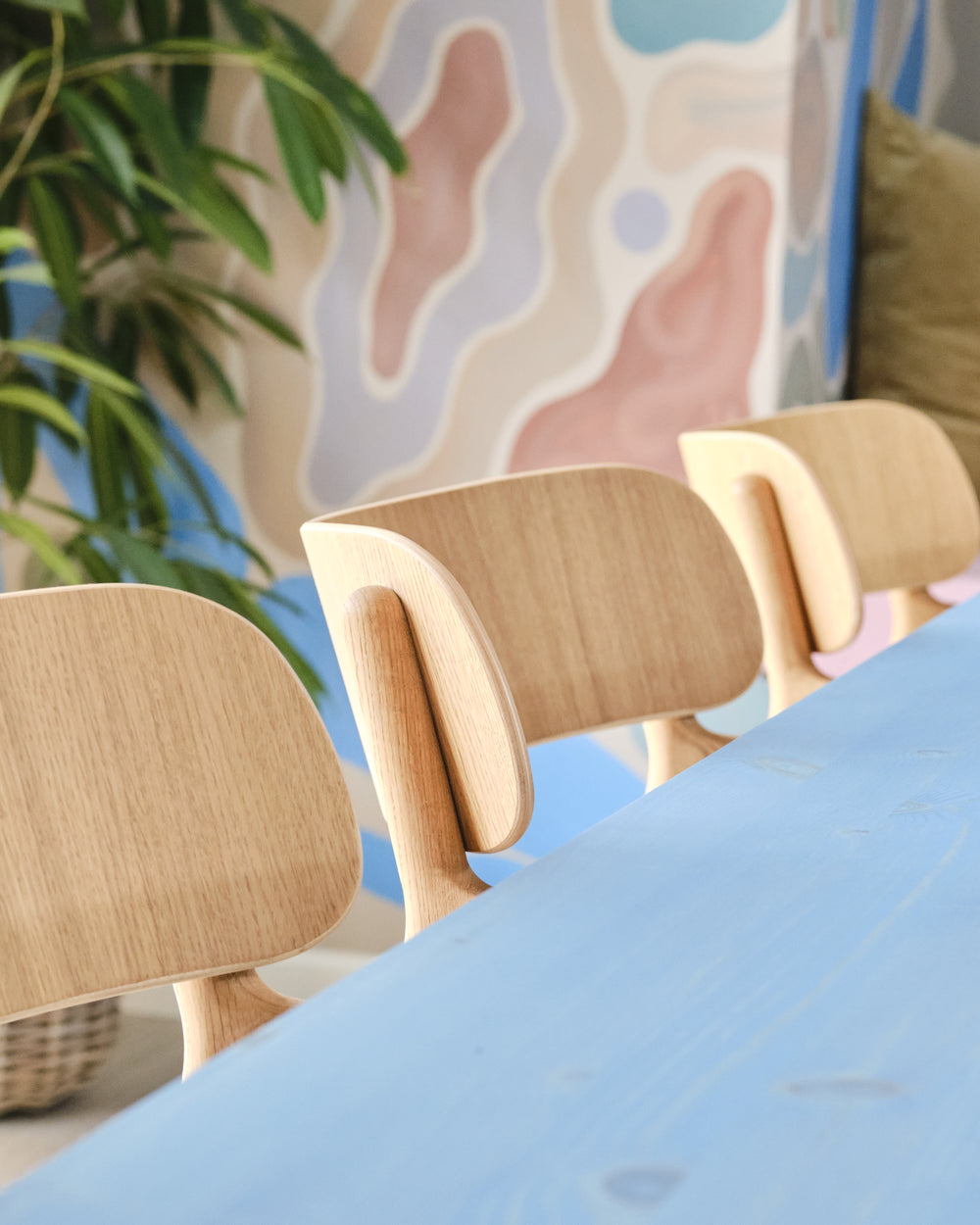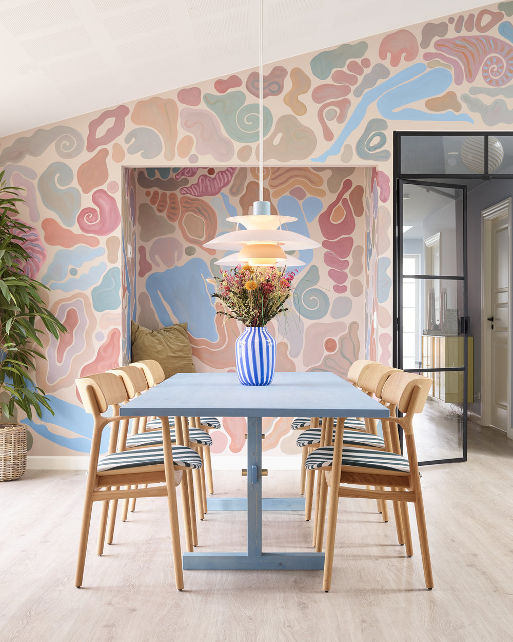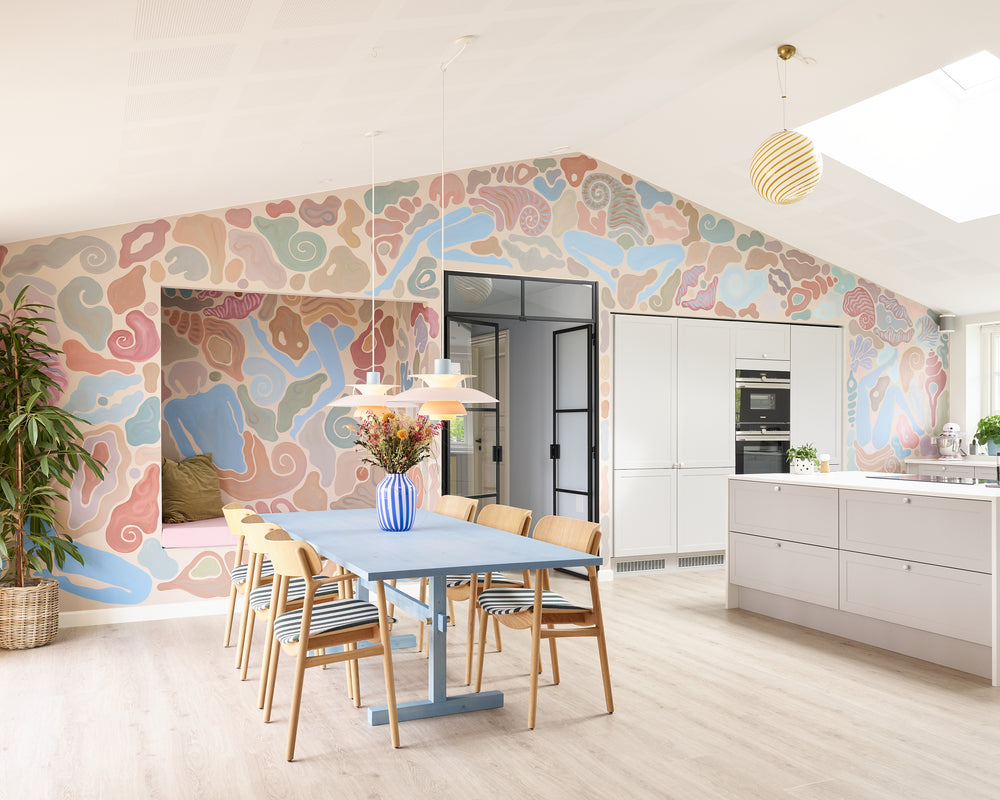 In this playful and light-filled home, colour becomes both architecture and atmosphere. The hand-painted walls create an organic, flowing backdrop, where the blue Gaspard Tableau dining table anchors the space with calm presence. A piece that feels both bold and serene - bringing balance to a room full of life, movement and everyday gatherings.