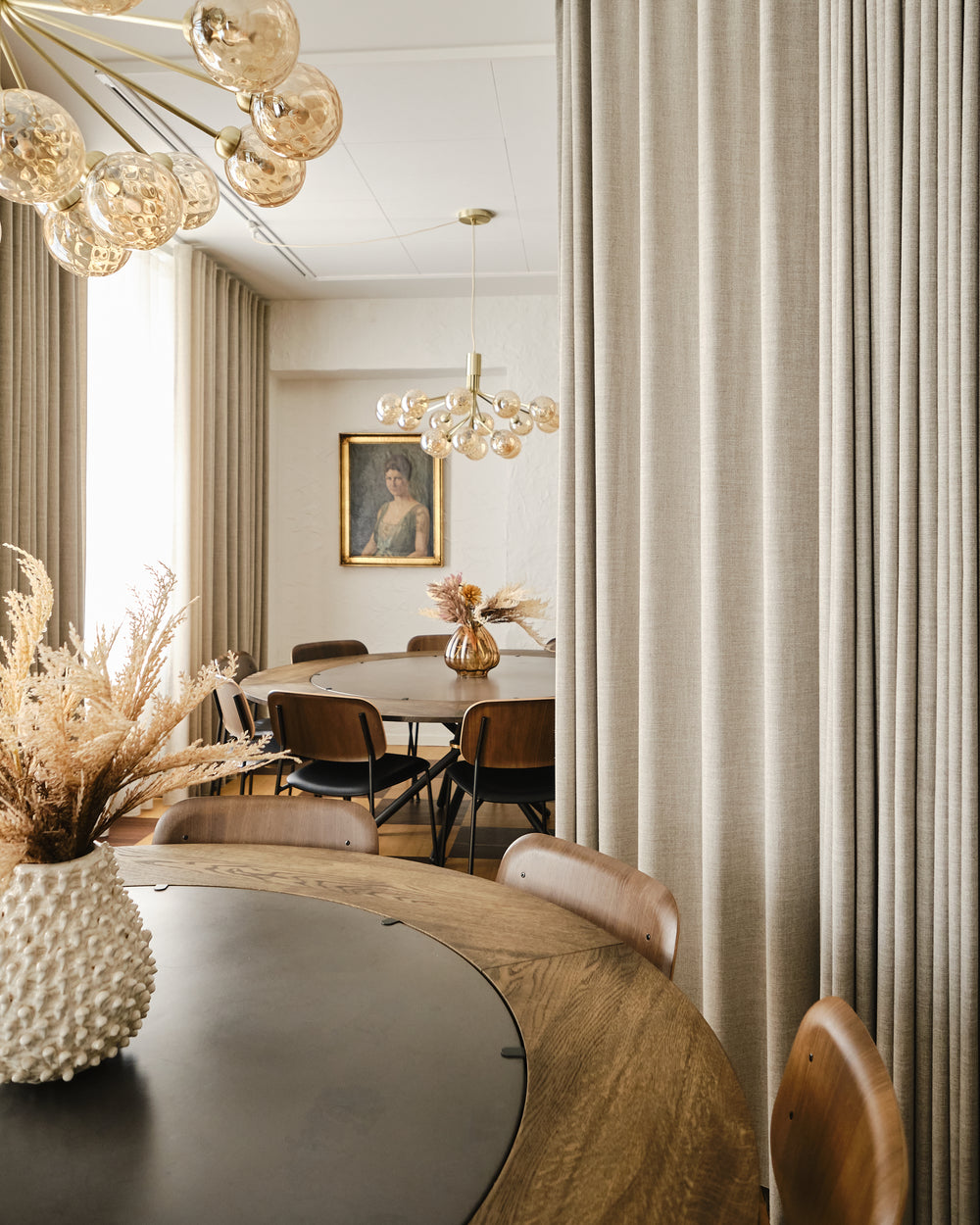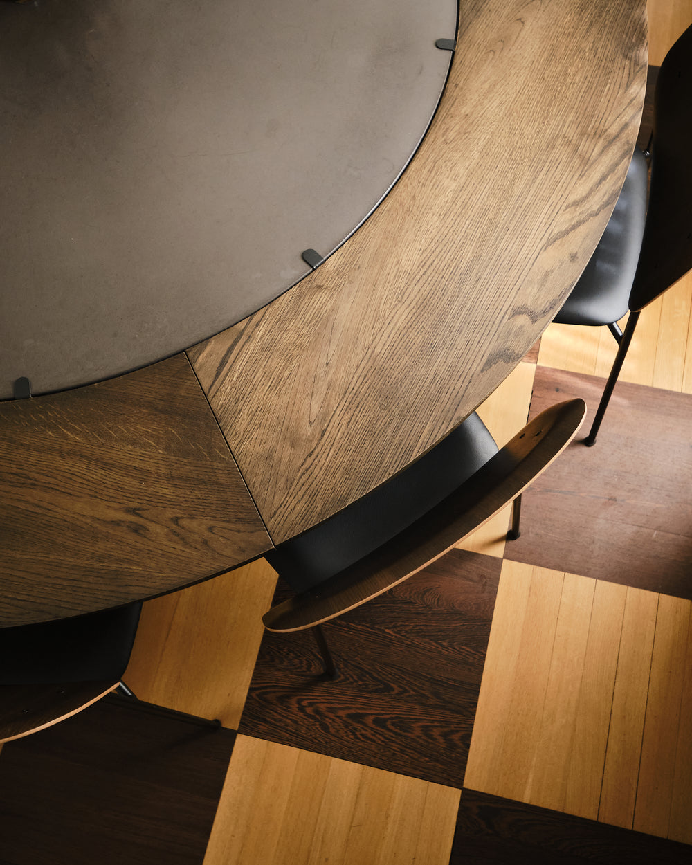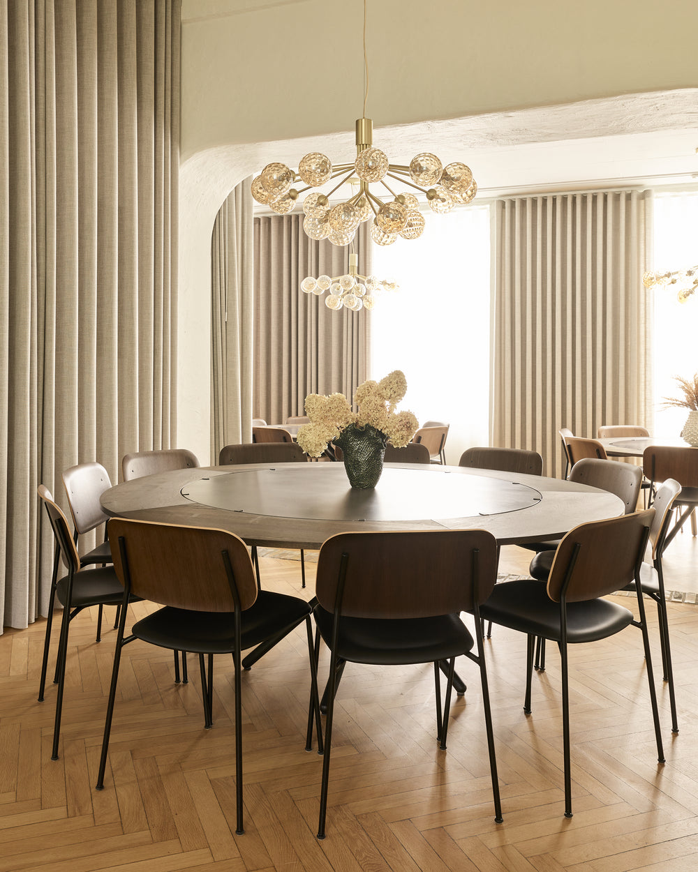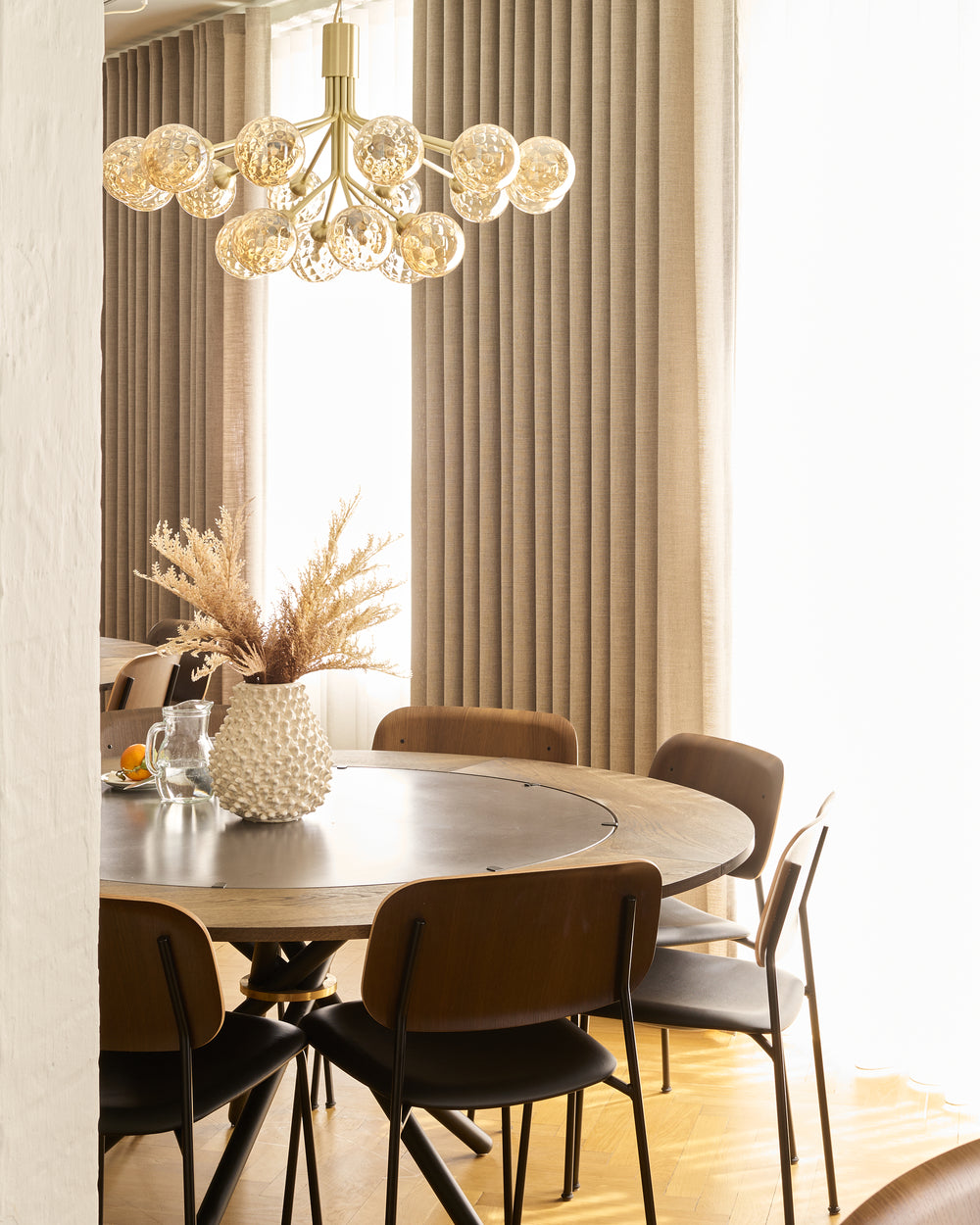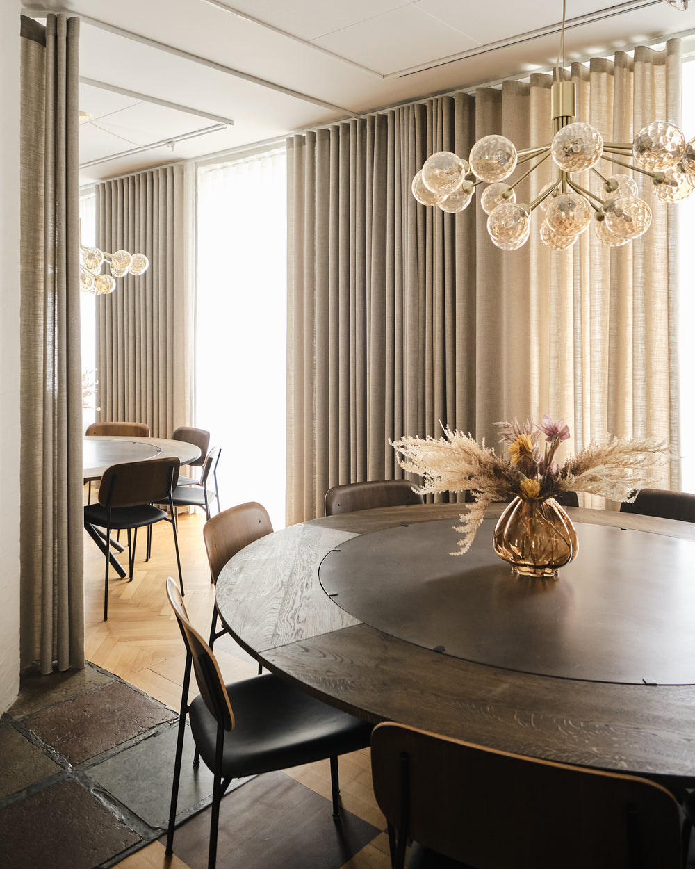 The round Hector table in dark concrete becomes the gathering point - a sculptural centrepiece that invites conversation and slow meals shared around its generous form. With the dark oak extension leaves, the table shifts effortlessly from intimate moments to larger gatherings, always maintaining its quiet presence and depth.