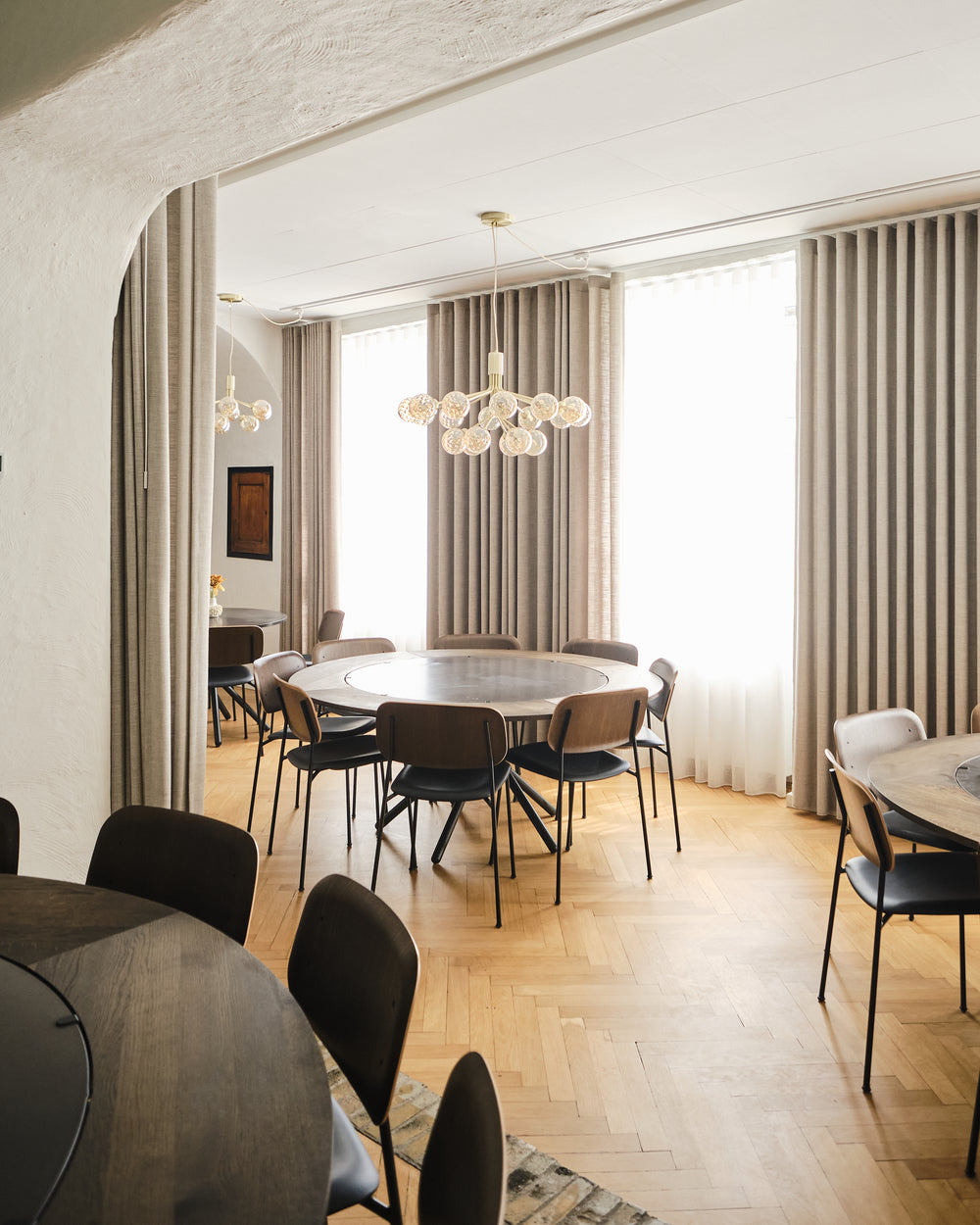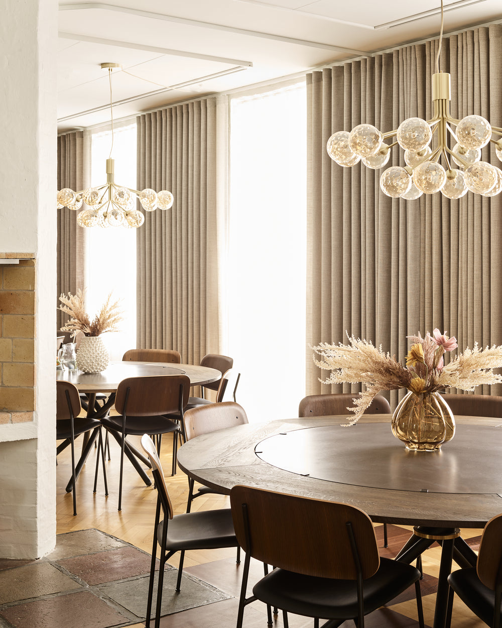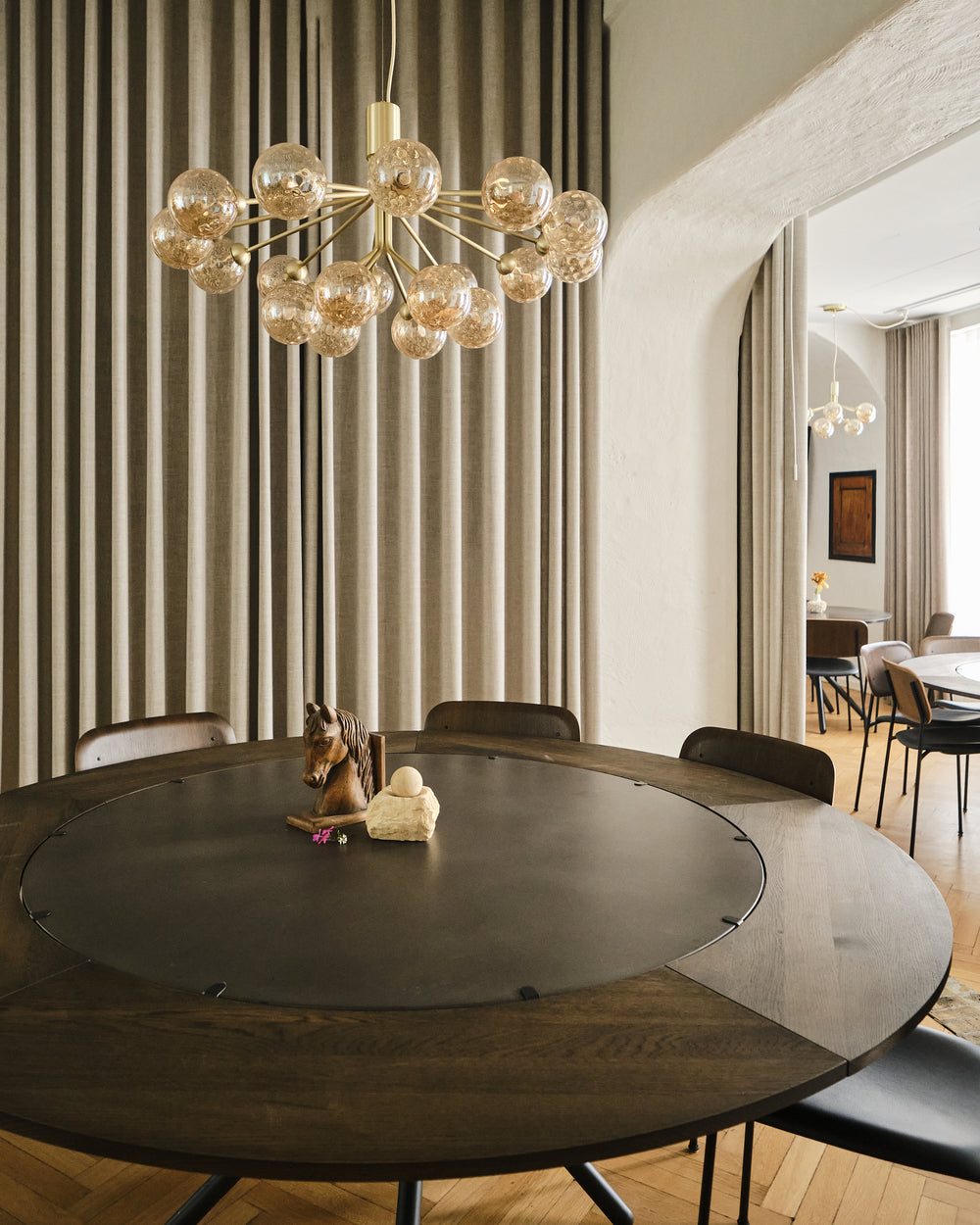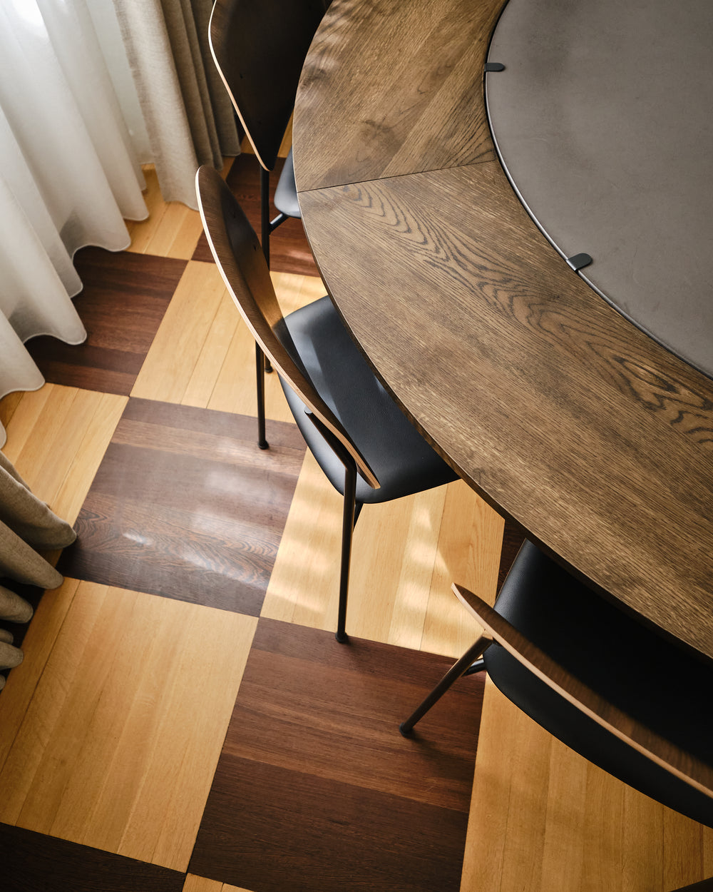 The round Hector table in dark concrete becomes the gathering point - a sculptural centrepiece that invites conversation and slow meals shared around its generous form. With the dark oak extension leaves, the table shifts effortlessly from intimate moments to larger gatherings, always maintaining its quiet presence and depth.