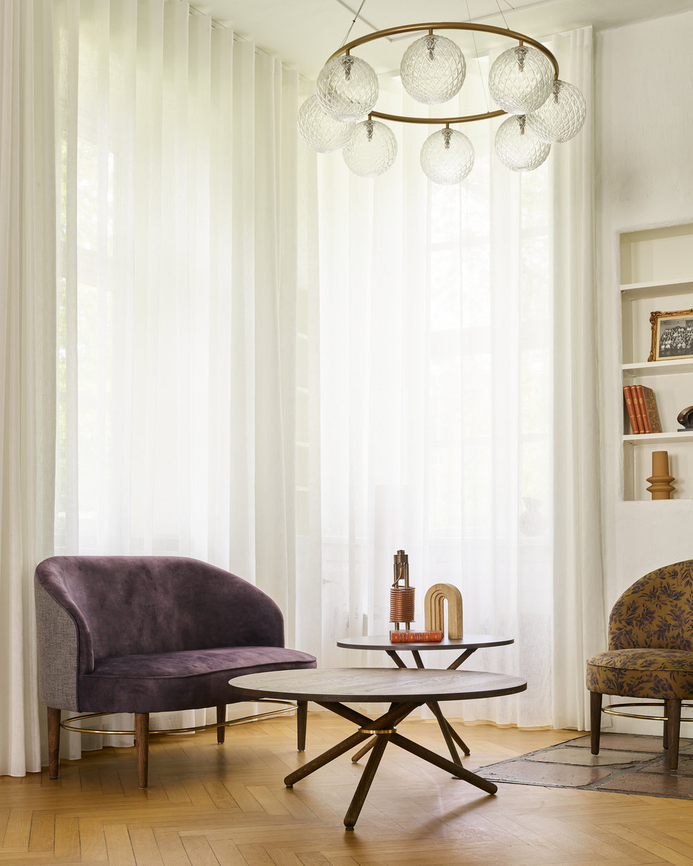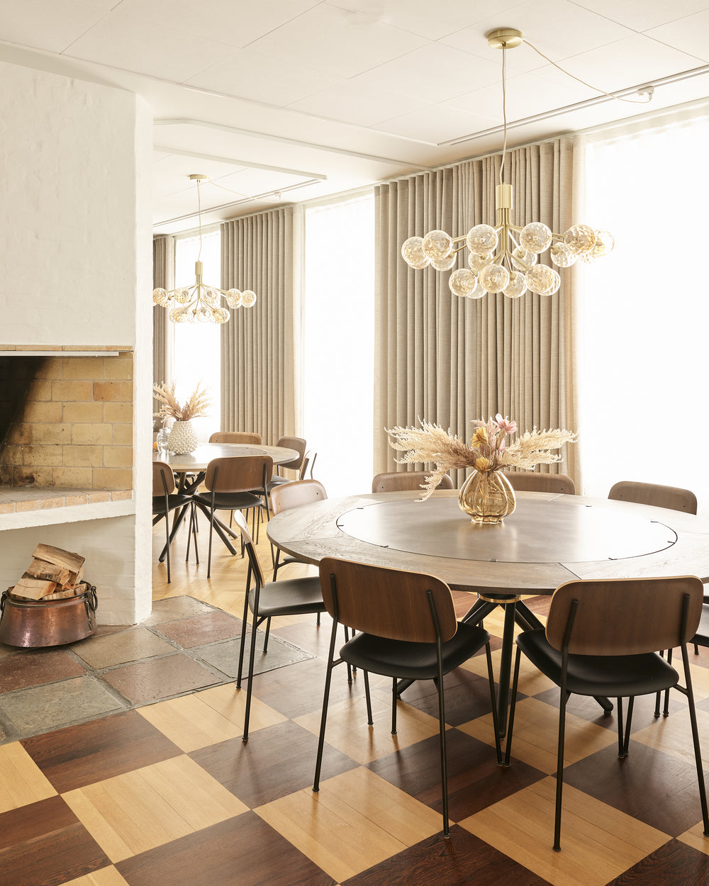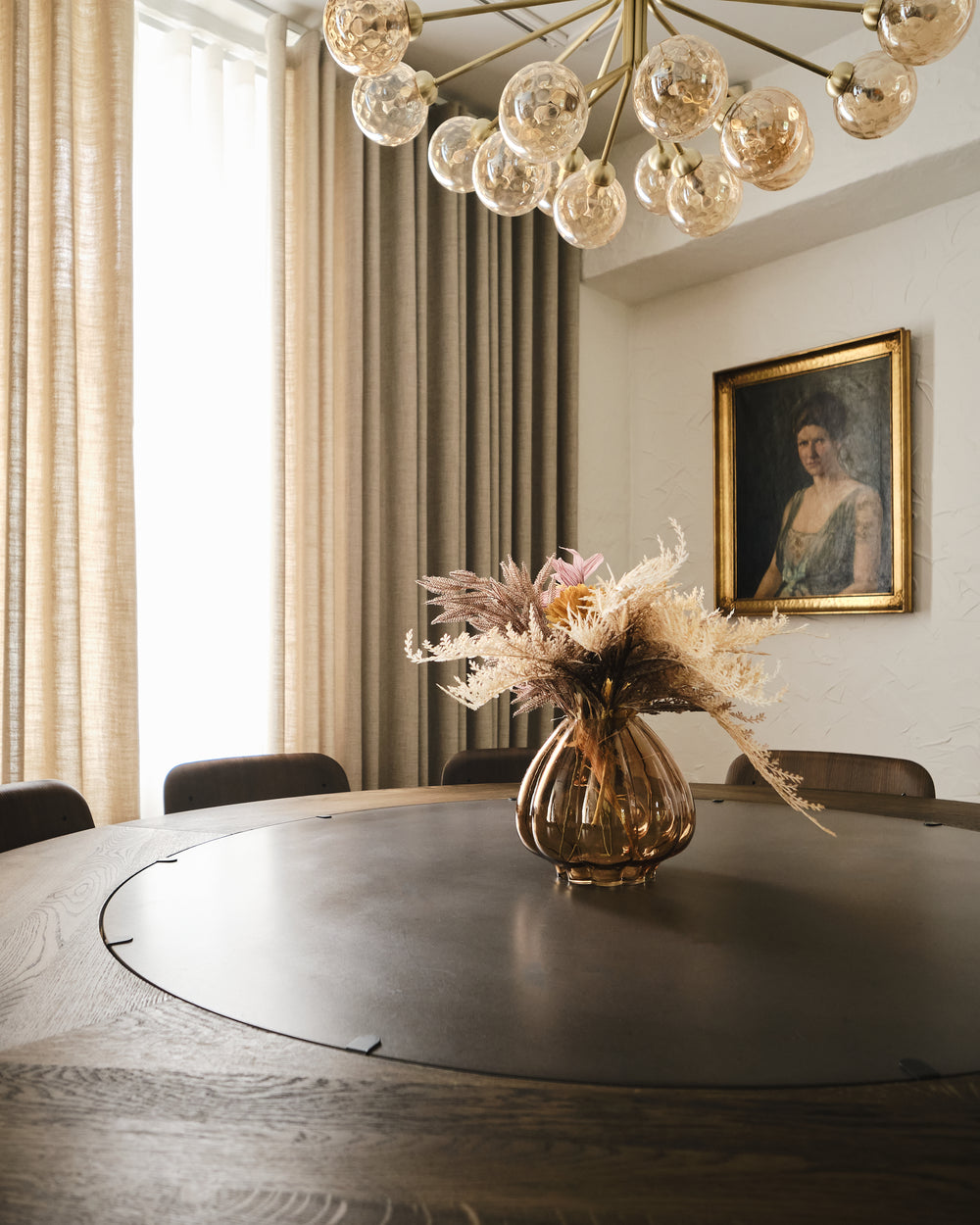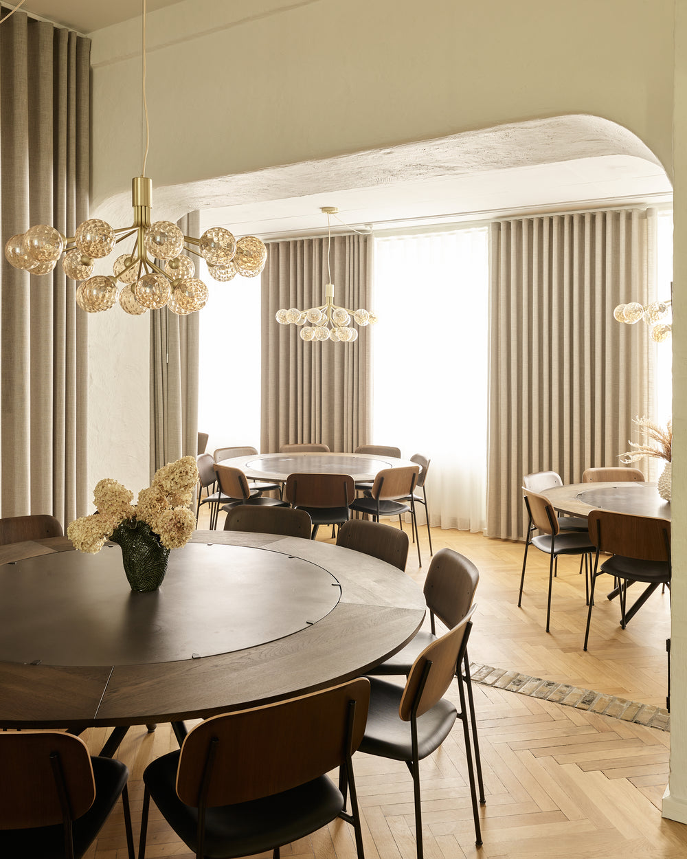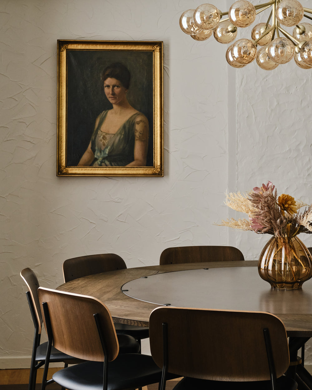 The round Hector table in dark concrete becomes the gathering point - a sculptural centrepiece that invites conversation and slow meals shared around its generous form. With the dark oak extension leaves, the table shifts effortlessly from intimate moments to larger gatherings, always maintaining its quiet presence and depth.